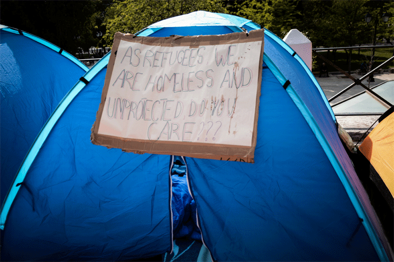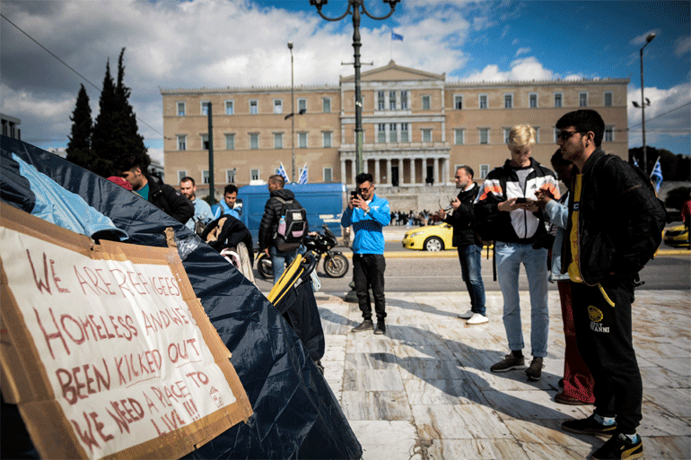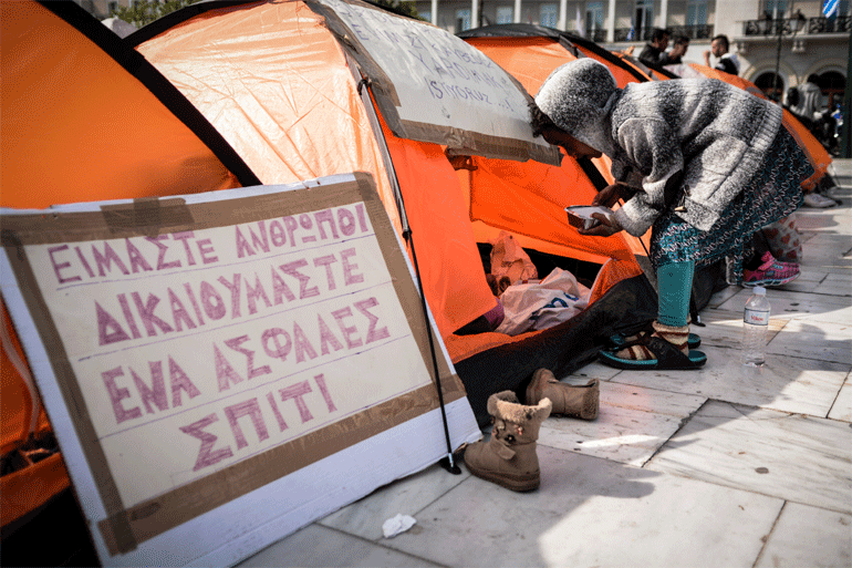 Οι μετανάστες και οι πρόσφυγες έχουν κατασκηνώσει απέναντι από τη Βουλή με πλακάτ και χαρτόνια που γράφουν συνθήματα όπως «γιατί μας αναγκάζετε να μένουμε σε σκηνές όταν υπάρχουν τόσα άδεια κτήρια» και «είμαστε οικογένειες, θέλουμε βοήθεια».