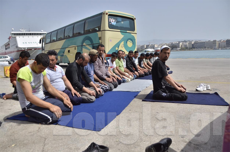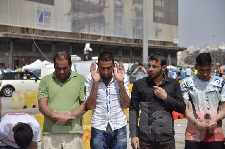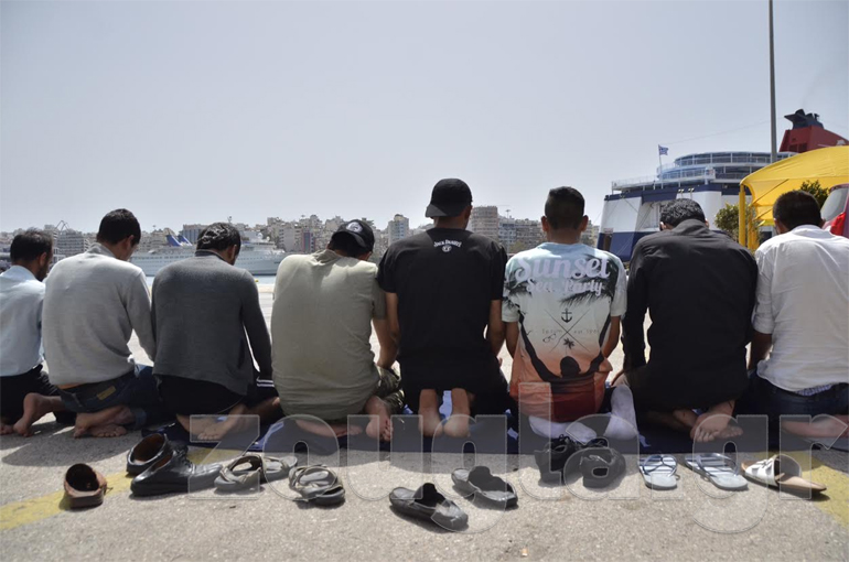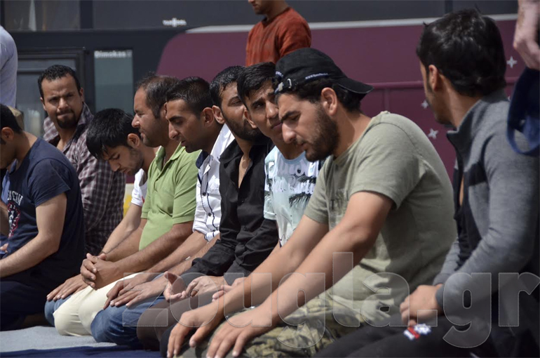 Την ίδια ώρα περίπου 20 πρόσφυγες έβγαλαν τα παπούτσια τους, κάθισαν πάνω σε κουβέρτες και προσευχήθηκαν.