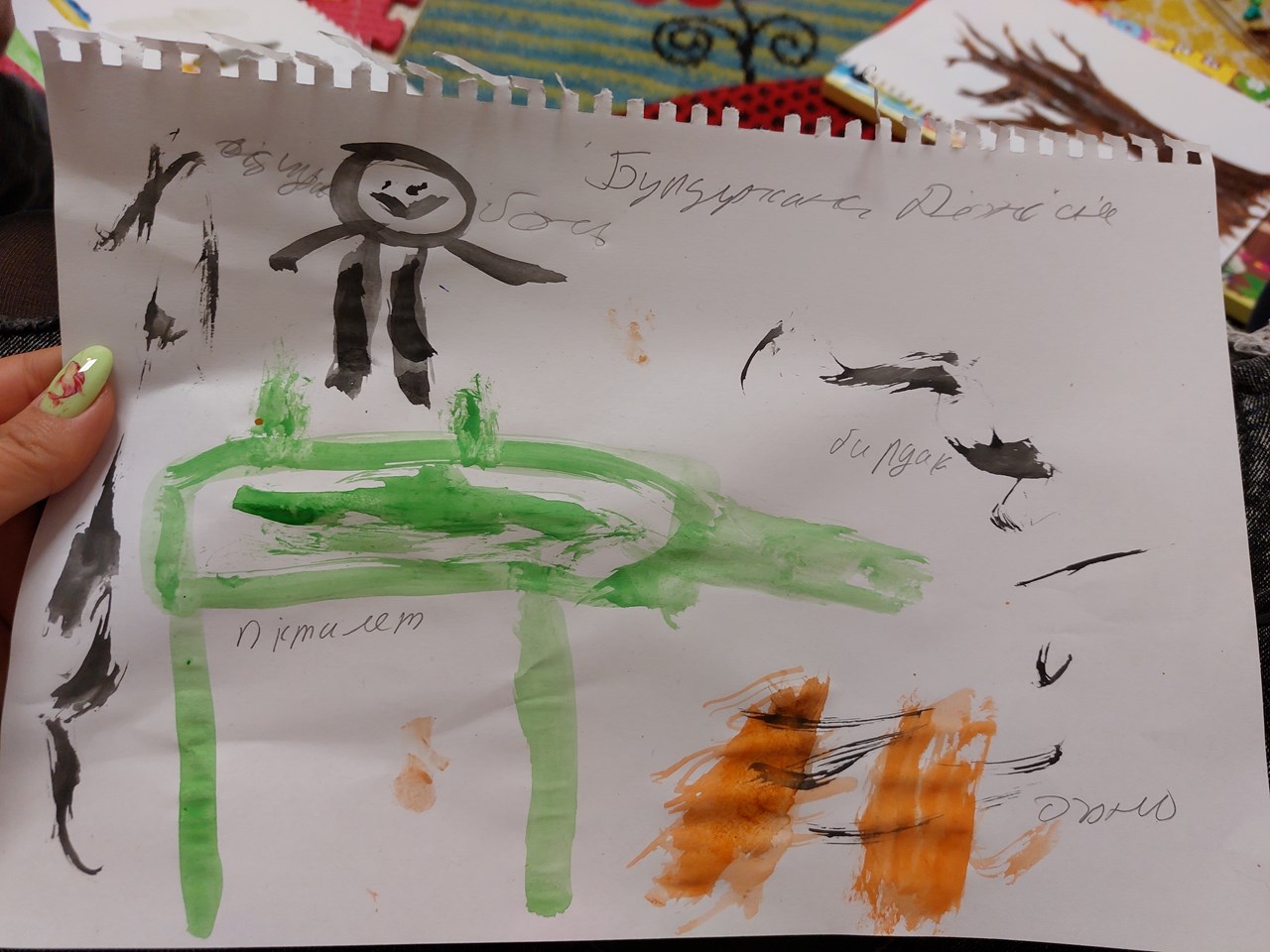 Ένα εννιάχρονο κορίτσι από την Ουκρανία ήρθε στην Ελλάδα με την οικογένειά της για διακοπές λίγες ημέρες πριν από την έναρξη του πολέμου και εγκλωβίστηκαν εδώ. Μπορεί να μην έχει εικόνα από πολεμικές συγκρούσεις, ωστόσο η έννοια του πολέμου έχει χαραχτεί βαθιά στην ψυχή της. Σε μία από τις ζωγραφιές που έκανε στο εργαστήριο αποτυπώνει δύο εκδοχές ενός δάσους. Στα αριστερά έχει ζωγραφίσει έναν μαύρο ουρανό και τα δέντρα παραδομένα στις φλόγες. Στα δεξιά ένα λαμπρό ήλιο πάνω από το δάσος. Όπως περιέγραψε στο μάθημα με δάκρυα στα μάτια η μία πλευρά δείχνει το πόσο τρομαγμένη είναι από τον πόλεμο και η άλλη το πόσο χαρούμενη ήταν πριν.