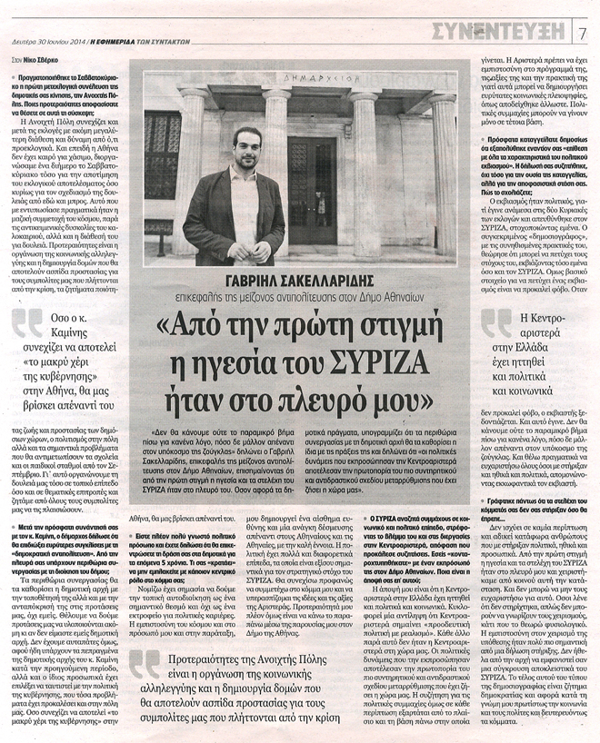 Τα λόγια είναι περιττά, όταν η πένα αποτυπώνει την πραγματικότητα. Ιδιαίτερα δε όταν η πραγματικότητα προέρχεται και γράφεται από τον βραβευμένο συγγραφέα Γιώργο Σκαμπαρδώνη… Παραθέτουμε το άρθρο από τη στήλη «Αστειατόριον» του Γ. Σκαμπαρδώνη που δημοσιεύτηκε στην εφ. «Μακεδονία της Κυριακής» και τη συνέντευξη του υποψηφίου δημάρχου Αθηναίων Γαβριήλ Σακελλαρίδη στην «Εφημερίδα των Συντακτών»…