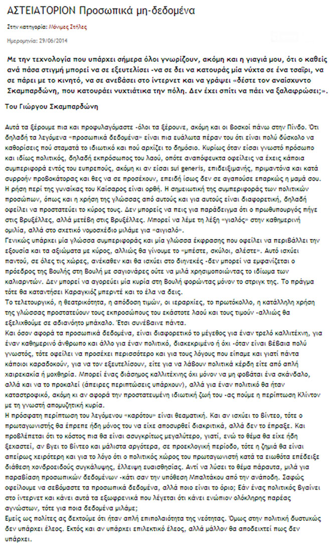 ΥΓ. 2 Οι χυδαίες επιθέσεις εξηγούνται μόνο εάν κάποιος δεν έλαβε σοβαρά υπ’ όψιν του την ανοησία, την έλλειψη σοβαρότητας και την απόλυτη ανευθυνότητα του Σακελλαρίδη, να κάνει τα πιο απίστευτα πράγματα με όποιον άγνωστο έβρισκε μπροστά του στο διαδίκτυο, καθιστώντας κατ’ αυτόν τον τρόπο τα προσωπικά του δεδομένα… δημόσια.