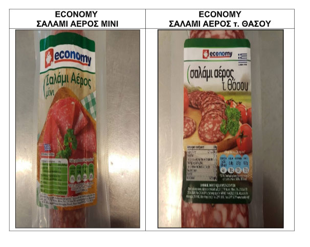 «Economy-Σαλάμι αέρος, τ. Θάσου», βάρος: 120 γρ. σε φέτες, αριθ. Παρτίδας: L 02196, ημ. ανάλωσης έως: 10.01.2021 και «Economy-mini αέρος», βάρος: 200 γρ. σε φέτες, αριθ. Παρτίδας: L 02177, ημ. ανάλωσης έως: 04.01.2021.