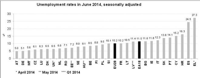 Σταθερά πρώτη στην ανεργία παραμένει η Ελλάδα (27,3% τον Απρίλιο του 2014) μεταξύ των χωρών της Ε.Ε. Όπως ανακοίνωσε η Ευρωπαϊκή Στατιστική Υπηρεσία (Eurostat), στην ευρωζώνη το ποσοστό της ανεργίας υποχώρησε στο 11,5% τον Ιούνιο από 11,6% τον προηγούμενο μήνα και 12,0% τον Ιούνιο του 2013. Πρόκειται για το χαμηλότερο επίπεδο από το Σεπτέμβριο του 2012.