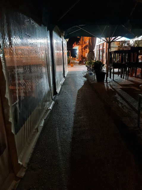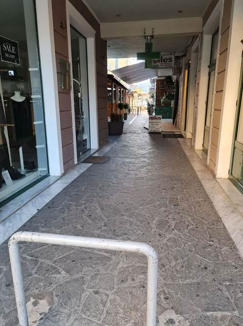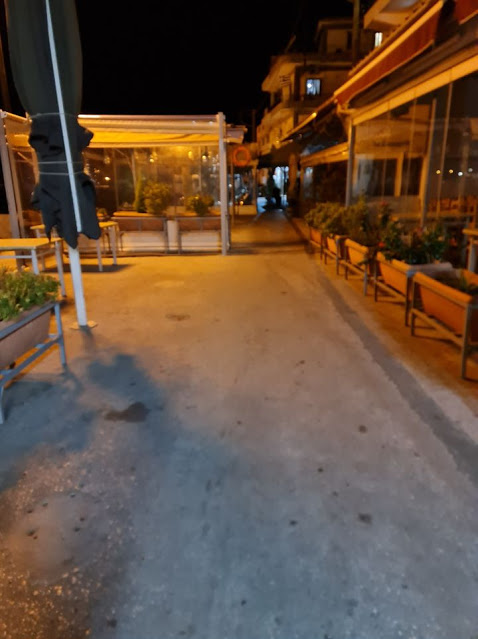 Μονάχα τα ελάχιστα καταστήματα που έχουν μείνει ανοιχτά έδιναν έναν ανεπαίσθητο παλμό στο κέντρο αλλά και αυτά χωρίς μουσικές, χωρίς φωτεινές επιγραφές και ταμπέλες για να προσελκύσουν, παρά μόνο μικρές ταμπέλες όπου απλά ενημερώνουν πως διαθέτουν υπηρεσίες διανομής και take away.