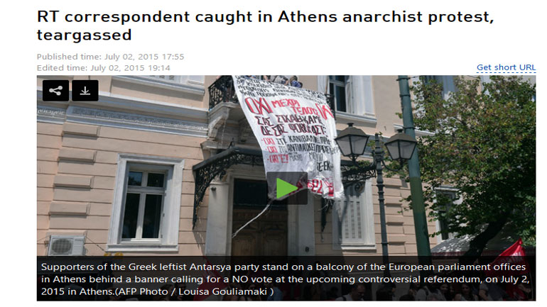 Ένα από τα μεγαλύτερα ρωσικά ειδησεογραφικά δίκτυα, το RT, φιλοξενεί στο πρωτοσέλιδό του την είδηση ότι ο ανταποκριτής του δέχτηκε χημικά από την αστυνομία, κατά τη διάρκεια της επέμβασης στα γραφεία της Ευρωπαϊκής Ένωσης, στη λεωφόρο Βασιλίσσης Σοφίας.