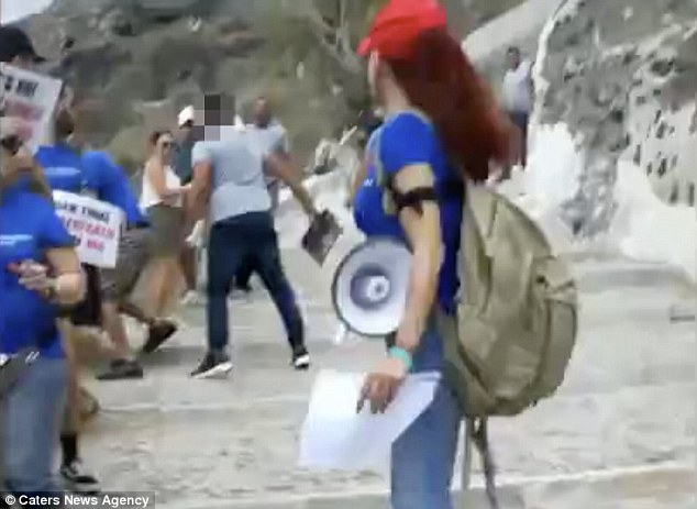 Στο βίντεο που ανήρτησαν στο λογαριασμό της οργάνωσης στο Facebook και αναπαράγει η βρετανική εφημερίδα, διακρίνεται ένας από τους ιδιοκτήτες να κυνηγά τους διαδηλωτές στα στενά καλντερίμια, να αρπάζει τα πλακάτ και να τους βρίζει, εκστομίζοντας απειλές.