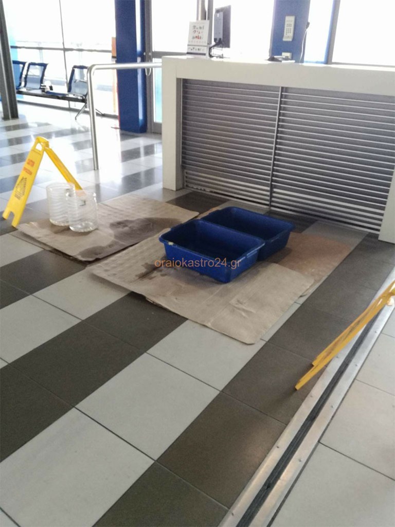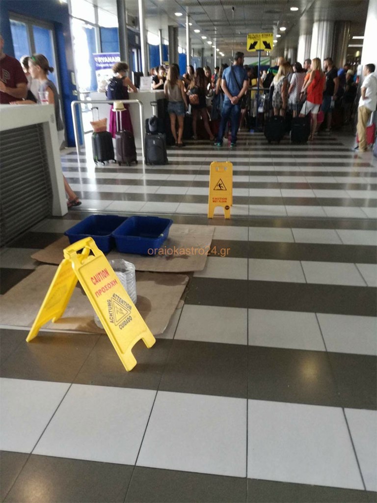 Κουβάδες, χαλάκια, και σφουγγαρίστρες επιστρατεύτηκαν για να συγκρατήσουν τα νερά που έσταζαν από την οροφή δημιουργώντας τριτοκοσμικές εικόνες στο αεροδρόμιο της Θεσσαλονίκης