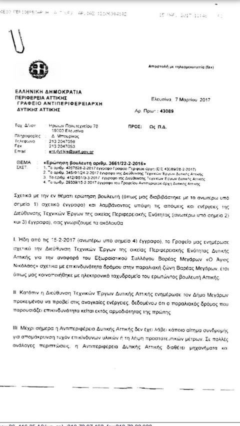 «Ο συντονισμός των δράσεων πραγματοποιήθηκε με την συνεργασία της Περιφέρειας Αττικής οπού είναι συνεχώς διπλά στον σύλλογο. Επισημαίνεται ότι παράλληλα είχαμε απευθυνθεί στον Δήμο Μεγαρέων ώστε να προβούν στον άμεσο καθαρισμό των φρεατίων υδροσυλλογής αλλά για πολλοστή φορά δεν έγιναν οι εργασίες, και έχουμε αρκετά προβλήματα στον παραλιακό δρόμο αυτές τις μέρες. Κάνουμε έκκληση στους οδηγούς να μην εισέρχονται στην περιοχή διότι έτσι θέτουν σε κίνδυνο την ασφάλειά τους» επισημαίνει στην ανακοίνωσή του στο Facebook ο Εξωραϊστικός & Πολιτιστικός Σύλλογος Βαρέας Μεγάρων ”Ο Άγιος Νικόλαος”.