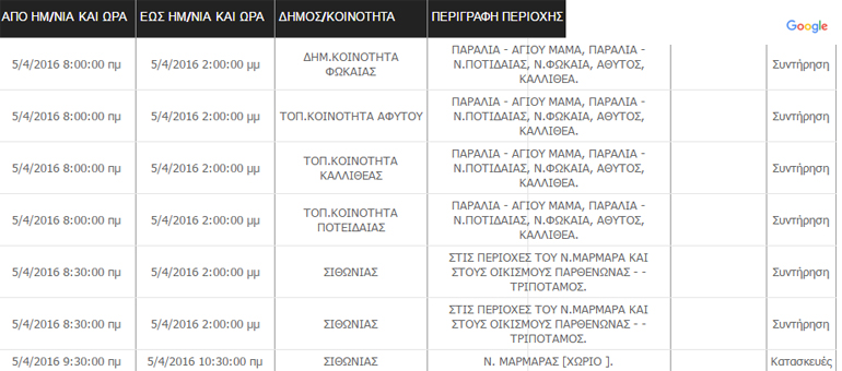 Διακοπές ρεύματος πραγματοποιούνται από το πρωί της Τρίτης σε περιοχές της Χαλκιδικής.
