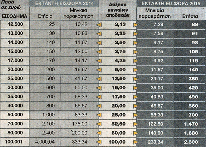 Μείωση κατά 30% από τον Ιανουάριο του 2015 στην έκτακτη εισφορά αλληλεγγύης για εισοδήματα άνω των 12.000 ευρώΣύμφωνα με τα όσα έχουν γίνει γνωστά, τα ποσοστά αυτά αφορούν όσους πολίτες κατάφεραν να διατηρήσουν -εν μέσω κρίσης- εισόδημα άνω των 12.000 ευρώ. Στόχος του κυβερνητικού επιτελείου είναι το 2016 να σταματήσει η είσπραξη της εισφοράς αλληλεγγύης, η οποία οδήγησε τα τελευταία χρόνια στην περαιτέρω συρρίκνωση μισθών και συντάξεων. Δημοσίευμα στην εφημερίδα «Τα Νέα Σαββατοκύριακο» αναφέρει ότι το πρώτο ψαλίδι στην έκτακτη εισφορά θα οδηγήσει σε αύξηση κατά 3 ευρώ του εισοδήματος όσων βρίσκονται στο όριο των 12.000 ευρώ. Παράλληλα, αύξηση κατά 20 ευρώ μηνιαίως θα έχουν οι μισθωτοί με ετήσιες αποδοχές 40.000 ευρώ.
