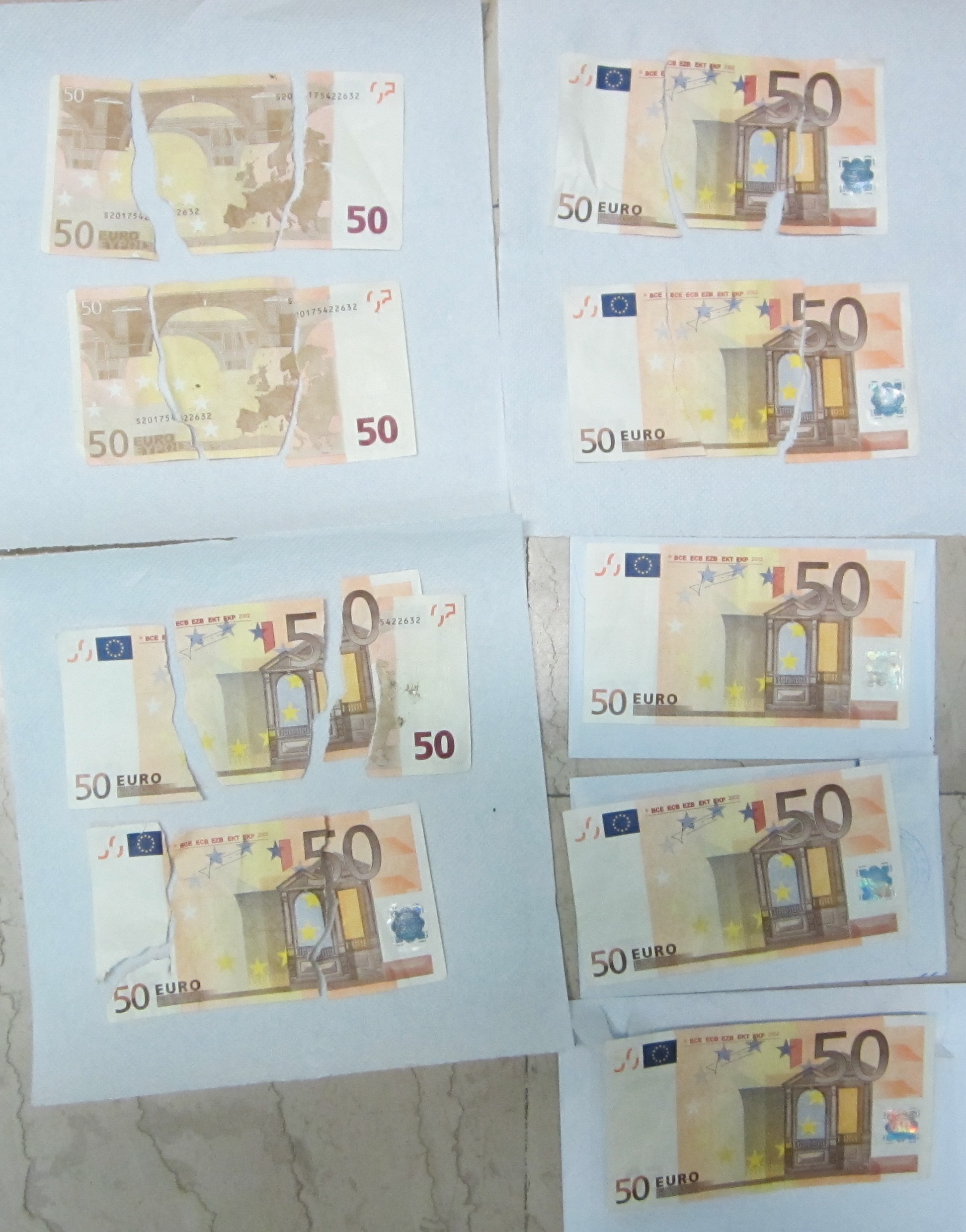 Από τις έρευνες των αστυνομικών, βρέθηκαν στη διαδρομή διαφυγής των δραστών προς τη Βουλγαρία και κατασχέθηκαν, 6 τεμαχισμένα παραχαραγμένα χαρτονομίσματα των 50 ευρώ και ένα μέρος από τεμαχισμένο παραχαραγμένο χαρτονόμισμα των 50 ευρώ, τα οποία τεμάχισαν και απέρριψαν οι τρεις αλλοδαποί.