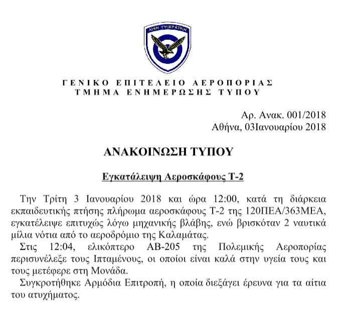 Η επίσημη ανακοίνωση του Γενικού Επιτελείου Αεροπορίας: