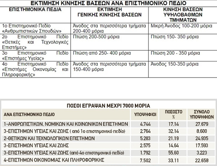«Στο πλαίσιο αυτό αναμένουμε τελικά στα περισσότερα τμήματα του Πεδίου άνοδο των βάσεων εισαγωγής της τάξεως των 200-400 μορίων κατά μέσο όρο. Στις περιζήτητες και υψηλόβαθμες σχολές του Πεδίου (Νομικές και Σχολές Ψυχολογίας) η αύξηση των βάσεων εισαγωγής αναμένεται να είναι μικρή επίσης, της τάξεως των 100-200 μορίων, καθώς θα υπάρχει αναχαίτιση λόγω της αύξησης των θέσεων εισακτέων» ανέφερε ο κ. Κάτσικας.