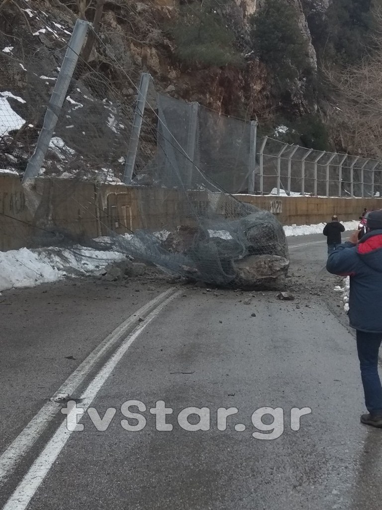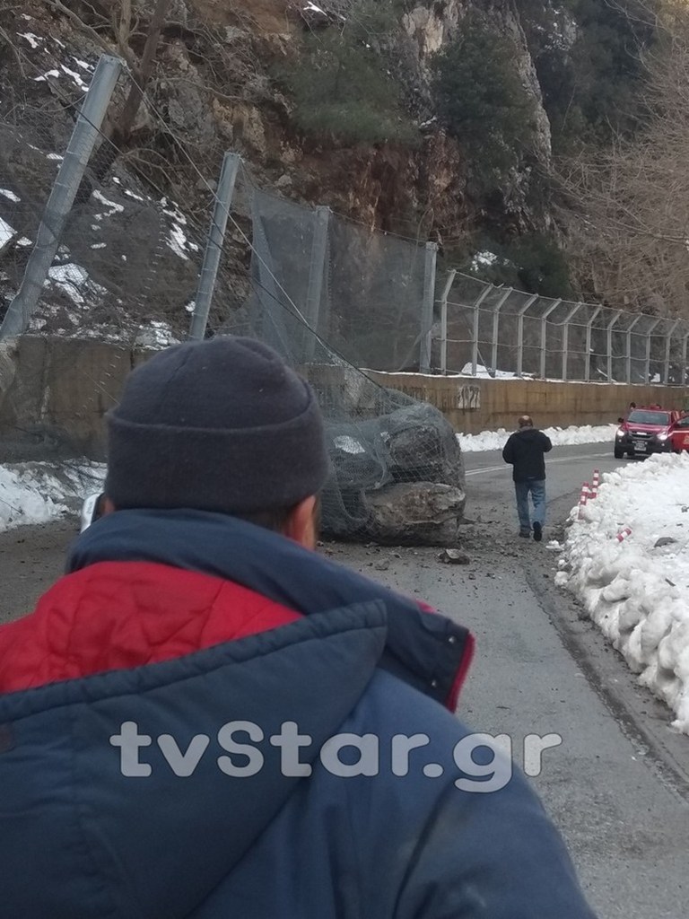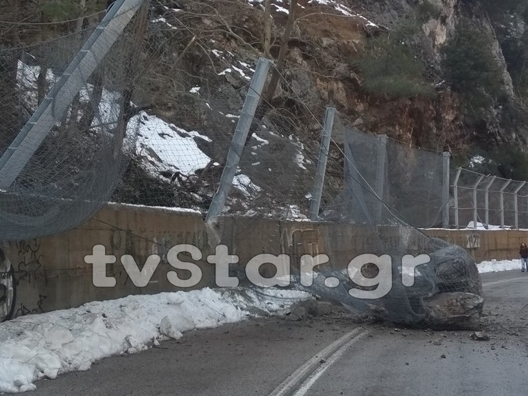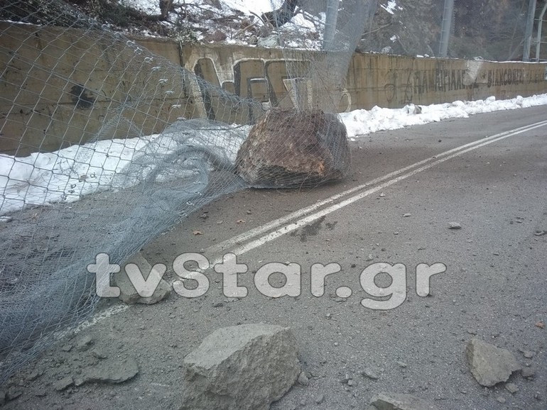 Ήταν δύο παρά το μεσημέρι όταν τέσσερις μεγάλοι βράχοι ξήλωσαν το προστατευτικό πλέγμα που έχει τοποθετηθεί από την περιφέρεια στο ύψος του Δερβενίου και έπεσαν επάνω στο οδόστρωμα, χωρίς ευτυχώς να περνά εκείνη την ώρα κάποιο αυτοκίνητο.