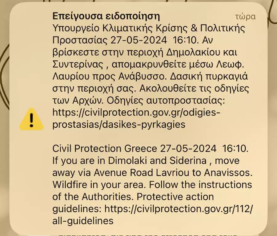 Συγκεκριμένα το μήνυμα αναφέρει: «Αν βρίσκεστε στην περιοχή Δημολακίου και Συντερίνας, απομακρυνθείτε μέσω Λεωφ. Λαυρίου προς Ανάβυσσο. Δασική πυρκαγιά στην περιοχή σας. Ακολουθείτε τις οδηγίες των αρχών».