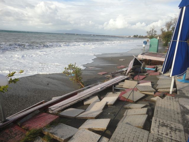 Η άμμος έφθασε μέχρι τη Ναυαρίνου, ενώ τα κύματα ξήλωσαν ομπρέλες και κατασκευές που είχαν παραμείνει στην παραλία από το καλοκαίρι.