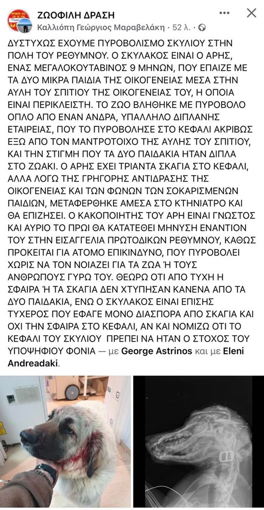 Όπως αναφέρει σε ανάρτησή της η «Ζωόφιλη Δράση», ο άνδρας που εργάζεται σε εταιρία δίπλα στο σπίτι της οικογένειας, πυροβόλησε στο κεφάλι τον σκύλο, ακριβώς έξω από τον μαντρότοιχο της αυλής του σπιτιού, δίπλα στα παιδιά τα οποία έντρομα άρχισαν να φωνάζουν.