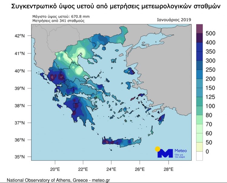 Πολύ μεγάλα ύψη βροχοπτώσεων καταγράφηκαν τον Ιανουάριο του 2019 σε ολόκληρη σχεδόν την Ελλάδα, σύμφωνα με την μετεωρολογική υπηρεσία meteo του Εθνικού Αστεροσκοπείου Αθηνών (ΕΑΑ).