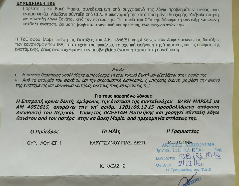 Αν και έχουν περάσει δύο έτη από την έκδοση της απόφασης του δικαστηρίου, η οποία έχει επιδοθεί κανονικά στο αρμόδιο γραφείο του ΕΦΚΑ στη Λέσβο, και μολονότι επανειλημμένα οι συγχωριανοί της έχουν απευθυνθεί στους αρμόδιους, οι οποίοι δηλώνουν ότι θυμούνται καλά τη Μαρία, εντούτοις επί δύο ολόκληρα χρόνια η γυναίκα δεν έχει λάβει ούτε ευρώ!