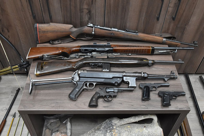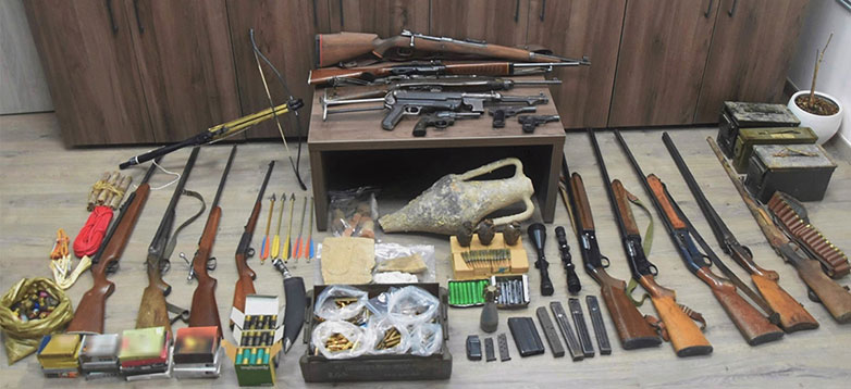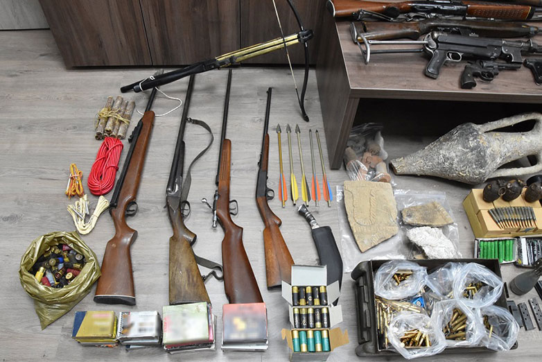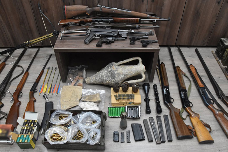 4 πολεμικά τυφέκια, 2 πιστόλια, 1 μακρύκανο πυροβόλο όπλο, 1 περίστροφο, 3 χειροβομβίδες, 1 αεροβόλο, 7 κυνηγετικά όπλα, 12 γεμιστήρες, 2.000 φυσίγγια διαφόρων τύπων και διαμετρημάτων, 343 γραμμάρια ζελατοδυναμίτιδα, 6 μασούρια δυναμίτη, 1 ακαριαίο φυτίλι, 14 πυροκροτητές, Τμήμα οβίδας όλμου, 70 κροτίδες, 1 μαχαίρι, 6 θήκες πιστολιών και περιστρόφων, 2 διόπτρες μακρύκανου όπλου, 1 βαλλίστρα με 6 βέλη, 1 πήλινος αμφορέας και πλήθος πήλινων και λίθινων θραυσμάτων αγνώστου χρονικής περιόδου και 1 κυλινδρικό αντικείμενο (τύπου βραχιόλι).