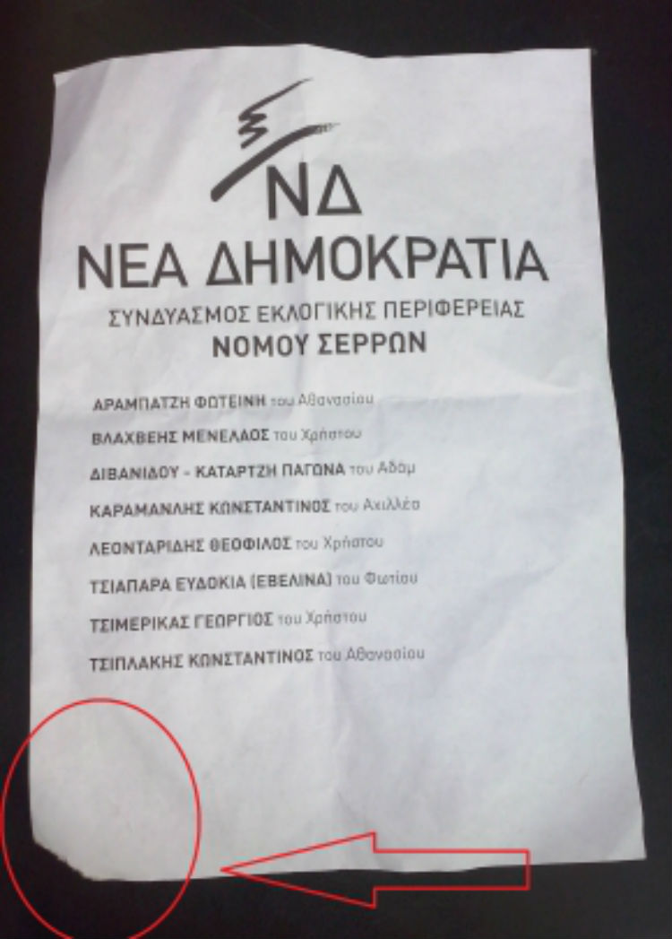Συγκεκριμένα, σχεδόν όλα τα ψηφοδέλτια της Νέας Δημοκρατίας για την περιφέρεια των Σερρών που δόθηκαν στους ψηφοφόρους ήταν κομμένα ή σχισμένα.