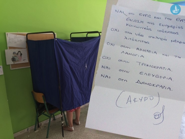 «ΝΑΙ στο ΕΥΡΩ και την ΕΥΡΩΠΑΪΚΗ ΕΝΩΣΗ της ευημερίας και της κοινωνικής ισότητας. ΟΧΙ στα νέα σκληρά μέτρα λιτότητας. ΟΧΙ στην ΑΛΗΤΕΙΑ και τα ΛΑΜΟΓΙΑ. ΟΧΙ στην ΤΡΟΜΟΚΡΑΤΙΑ. ΝΑΙ στην ΕΛΕΥΘΕΡΙΑ. ΝΑΙ στη ΔΗΜΟΚΡΑΤΙΑ», έγραψε.