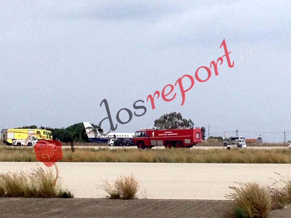 Το αεροπλάνο της «Sky Express», στο οποίο επέβαιναν 19 άτομα, βγήκε εκτός διαδρόμου εν μέσω θυελλωδών ανέμων κατά τη διάρκεια προσγείωσης στο αεροδρόμιο «Διαγόρας», με αποτέλεσμα να καταλήξει στα χωράφια και να σκάσει ο αριστερός τροχός, ο οποίος σύμφωνα με δημοσίευμα του rodosreport.gr τυλίχτηκε στις φλόγες.