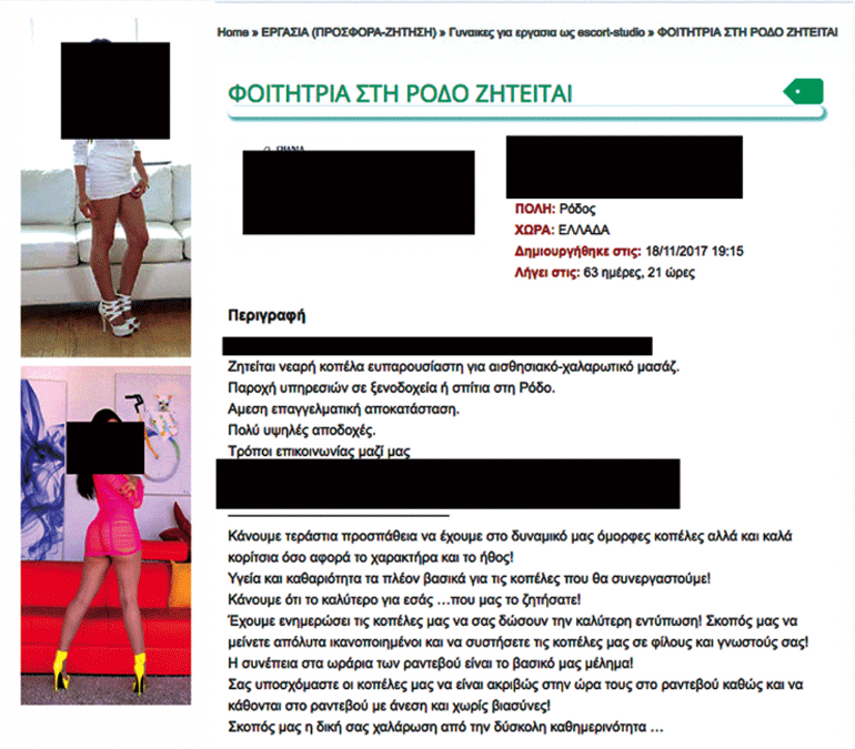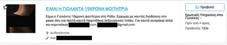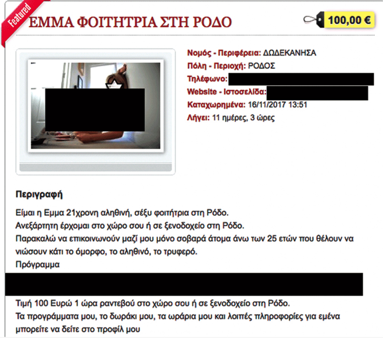 «Είμαι η Έμμα 21χρονη αληθινή, σέξυ φοιτήτρια στη Ρόδο. Ανεξάρτητη έρχομαι στο χώρο σου ή σε ξενοδοχείο στη Ρόδο. Παρακαλώ να επικοινωνούν μαζί μου μόνο σοβαρά άτομα άνω των 25 ετών που θέλουν να νιώσουν κάτι το όμορφο, το αληθινό, το τρυφερό και να είναι αποφασισμένοι ότι θέλουν να κάνουν ραντεβού!».