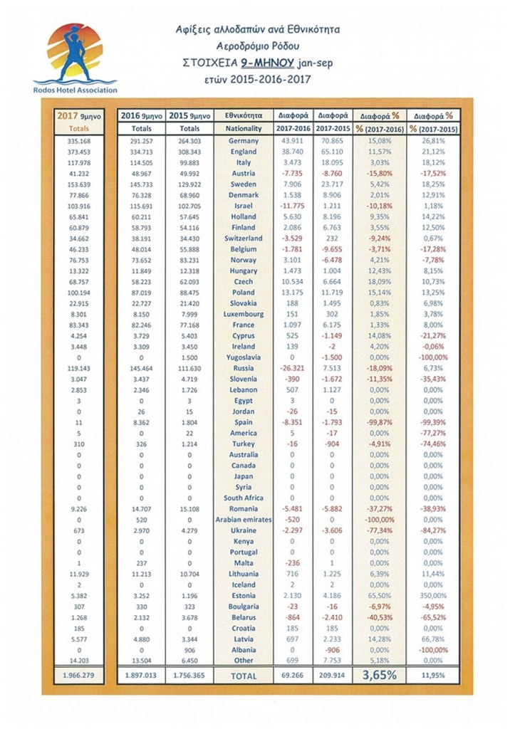 Από τα απολογιστικά στοιχεία του διαστήματος Ιανουαρίου-Σεπτεμβρίου, προκύπτει ότι επισκέφθηκαν αεροπορικώς τη Ρόδο, συνολικά 1.966.279 τουρίστες ενώ το ίδιο διάστημα πέρσι ο αριθμός τους είχε ανέλθει σε 1.897.013 άτομα. Δηλαδή το εννιάμηνο είχαμε 69.266 περισσότερους τουρίστες.