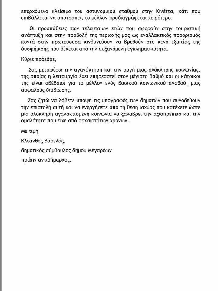 Επιστολή αγανάκτησης για την εγκληματικότητα στα Μέγαρα είχαν αποστείλει ήδη από το 2016 1554 κάτοικοι του Δήμου Μεγαρέων όπως και η Ομοσπονδία Συλλόγων Κινέτας, και των συλλόγων Άγιος Παντελεήμων Βλυχάδας Νέας Περάμου, Ντουράκο Αλεποχωρίου, Άγιος Ιωάννης Μακρινός.