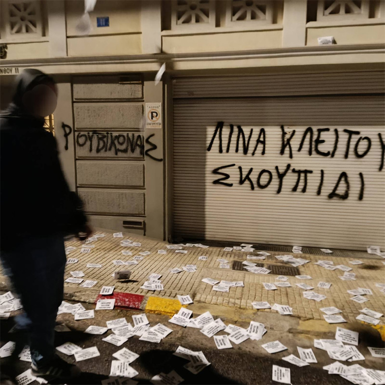 Παρέμβαση έξω από το σπίτι της δημοσιογράφου Λίνας Κλείτου, στου Φιλοπάππου, πραγματοποίησε η αναρχική συλλογικότητα «Ρουβίκωνας», το βράδυ της Τετάρτης.