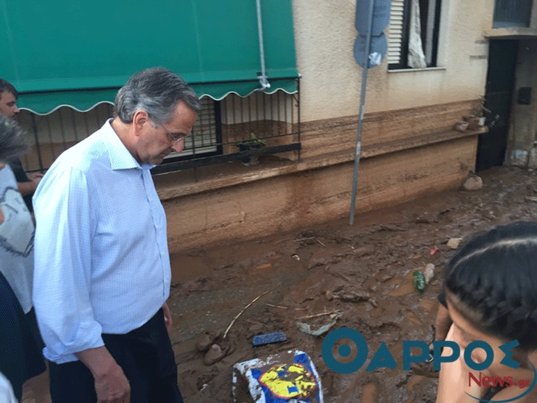 Γειτονιές στην πόλη της Καλαμάτας που δοκιμάστηκαν από τη φονική κακοκαιρία επισκέφθηκε την Τετάρτη ο πρώην πρωθυπουργός Αντώνης Σαμαράς.