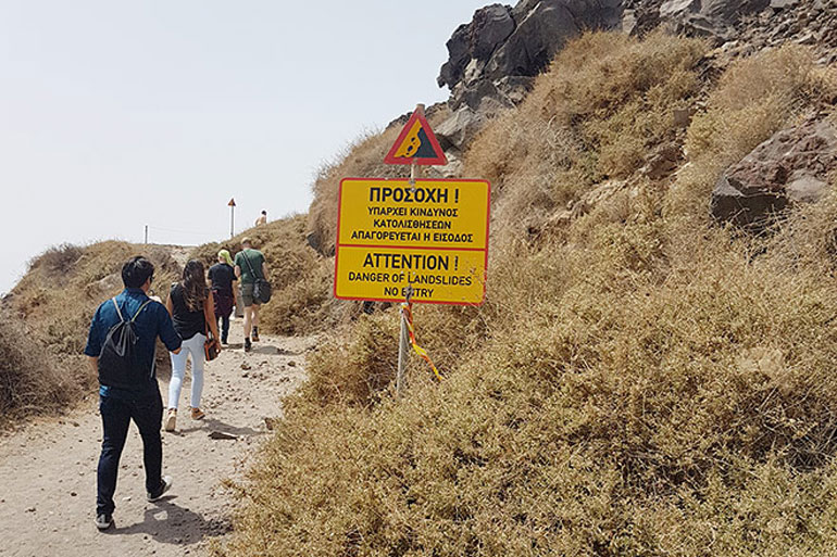 Η πραγματικότητα όμως είναι διαφορετική καθώς μεγάλος αριθμός επισκεπτών, κυρίως στη διάρκεια της θερινής τουριστικής περιόδου, αγνοεί τις προειδοποιητικές πινακίδες που έχει τοποθετήσει ο Δήμος Θήρας και επισκέπτεται τους επικίνδυνους για κατολίσθηση χώρους.