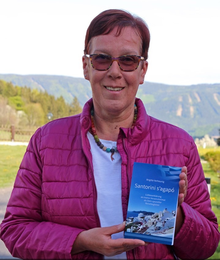 «Ερωτική εξομολόγηση στην πατρίδα της καρδιάς μου, ως δικός σου ταξιδιωτικός συνοδός», γράφει η Αυστριακή Μπριγκίτε Βέρχουνικ σαν υπότιτλο του πρώτου της βιβλίου «Santorini s’ agapo» (στα γερμανικά), που δεν θέλει να είναι – και δεν είναι – ένας συμβατικός ταξιδιωτικός οδηγός και το οποίο κυκλοφορεί σε τρεις διαφορετικές μορφές: ως έντυπο χαρτόδετο, έντυπο με σκληρό εξώφυλλο και eBook.
