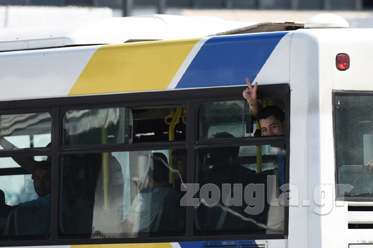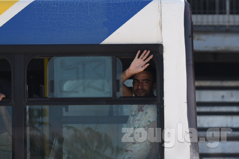 Στις 08.20 οι πρόσφυγες και οι μετανάστες άρχισαν να μπαίνουν στα πούλμαν, προκειμένου να μεταφερθούν σε κέντρα φιλοξενίας στη Θήβα, στα Οινόφυτα και στο Δερβένι.