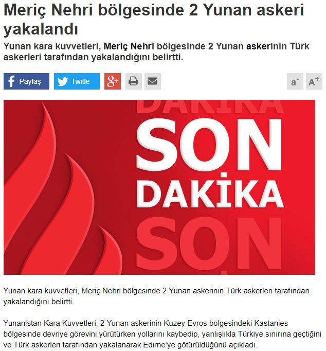 Η «Hurriyet» και η «Milliyet» χωρίς να αναβαθμίσουν την είδηση σε πρωτοσέλιδο συμπεριέλαβαν την ειδησεογραφία στις πρωτεύουσες ειδήσεις δίχως να σηκώσουν ιδιαίτερα τους τόνους. Αργά το μεσημέρι η «Haber» μετέδωσε πως οι δύο Έλληνες στρατιωτικοί θα δικαστούν για κατασκοπεία και παράνομη είσοδο στην Τουρκία. Το ζήτημα της κατασκοπείας δεν έχει μέχρι στιγμής μεταδοθεί ή ανακοινωθεί από ανεπίσημη ή επίσημη πηγή στην Άγκυρα.