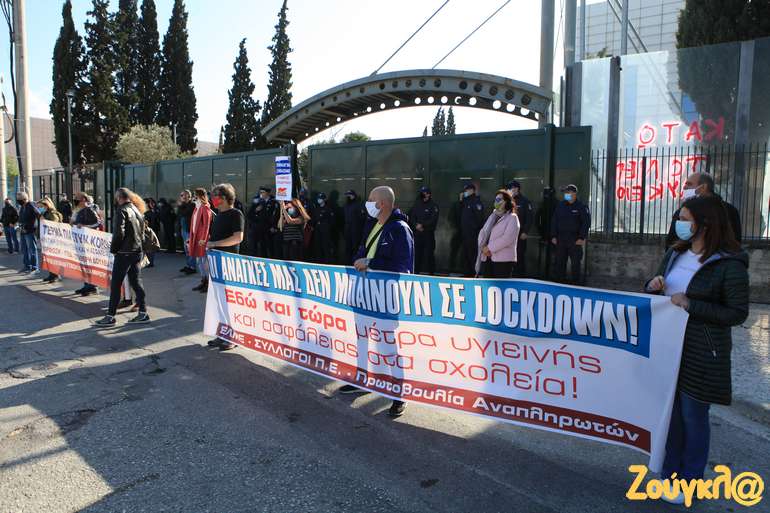 Συγκέντρωση διαμαρτυρίας πραγματοποίησαν εκπαιδευτικοί έξω από το Υπουργείο Παιδείας με αίτημά τους να παρθούν μέτρα κατά του κορωνοϊού στα σχολεία.