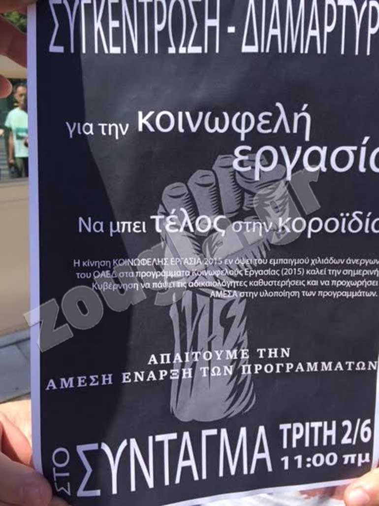 Συγκέντρωση διαμαρτυρίας πραγματοποιεί από τις 11.00 το πρωί της Τρίτης η «Κίνηση Κοινωφελούς Εργασίας 2015» ανέργων έξω από τη Βουλή, εξαιτίας της καθυστέρησης των αποτελεσμάτων από τον ΟΑΕΔ και έναρξης του προγράμματος κοινωφελούς εργασίας.
