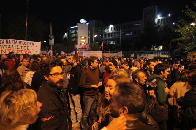 Οι εργαζόμενοι της πρώην ΕΡΤ μετά την ολοκλήρωση του απεργιακού δελτίου ειδήσεων περίπου στις 22.30, κάλεσαν τον κόσμο να παραμείνει όλη τη νύχτα μαζί τους στο Ραδιομέγαρο.