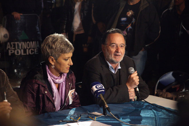 Ο βουλευτής του ΚΚΕ Σπύρος Χαλβατζής μιλώντας στους συγκεντρωμένους απηύθυνε χαιρετισμό συμπαράστασης στους απολυμένους της ΕΡΤ, ωστόσο κάποιοι συγκεντρωμένοι διαμαρτυρήθηκαν όταν ο βουλευτής είπε: «Να παλέψουμε όλοι για την ανατροπή της εφαρμοζόμενης πολιτικής». Τότε κάποιοι φώναζαν συνεχώς: «Όλοι μαζί! Μαζί! Μαζί!» και ο κ. Χαλβατζής απάντησε λέγοντας: «Αφήστε τις προβοκάτσιες».