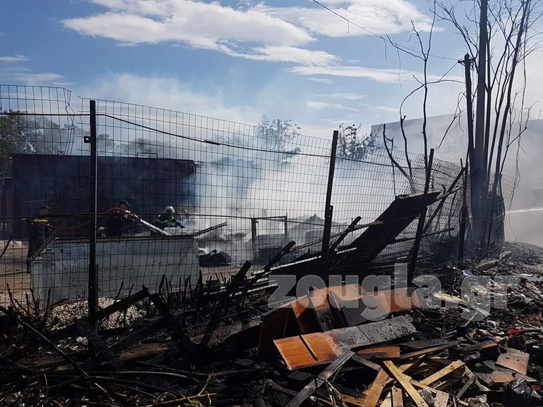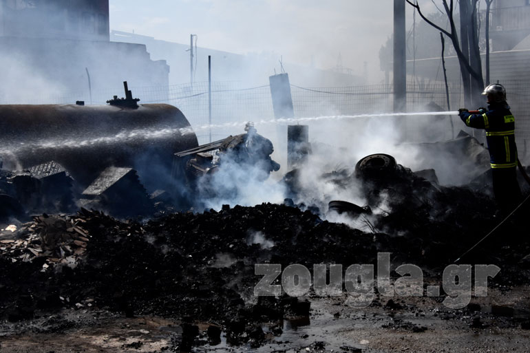 Στο σημείο επιχειρούν 11 οχήματα της πυροσβεστικής με 33 πυροσβέστες, ενώ η φωτιά κατακαίει λάστιχα και παλέτες.