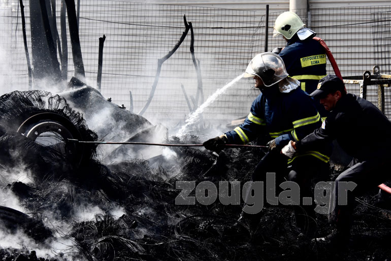 Στο σημείο επιχειρούν 11 οχήματα της πυροσβεστικής με 33 πυροσβέστες, ενώ η φωτιά κατακαίει λάστιχα και παλέτες.