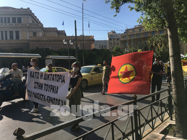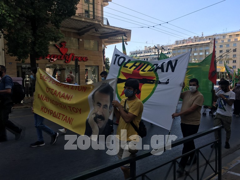 Με συνθήματα σε πανό όπως «Κάτω η δικτατορία στην Τουρκία του φασίστα Ερντογάν», αλλά και «Ελευθερία στον Οτσαλάν, αναγνώριση του Κουρδιστάν», επέλεξαν να εκφράσουν την αντίθεσή τους στον Τούρκο πρόεδρο Ρετζέπ Ταγίπ Ερντογάν, αλλά και την ξεκάθαρη θέση τους απέναντι στην αναγνώριση του Κουρδιστάν.