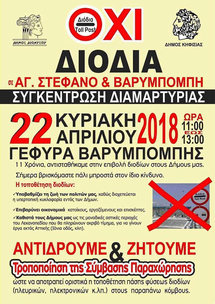 Οι πολίτες των περιοχών καταγγέλουν την εγκατάσταση διοδίων αναφέροντας σε ανακοίνωσή τους: «Οι Δήμοι Διονύσου και Κηφισιάς αντιδρούμε και ζητούμε: Τροποποίηση της Σύμβασης Παραχώρησης ώστε να αποτραπεί οριστικά η τοποθέτηση πάσης φύσεως διοδίων (πλευρικών, ηλεκτρονικών κλπ.) στους ανωτέρω κόμβους».