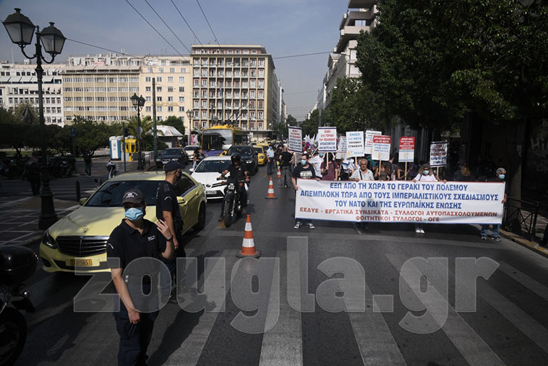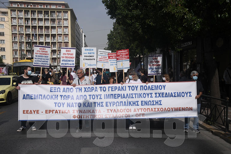 Ολοκληρώθηκε η συγκέντρωση διαμαρτυρίας στα Προπύλαια για την επίσκεψη του Γενς Στόλτενμπεργκ στην Ελλάδα που οργανώθηκε από την Ελληνική Επιτροπή για τη Διεθνή Ύφεση και Ειρήνη (ΕΕΔΥΕ).