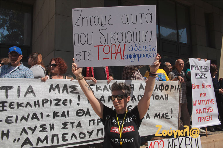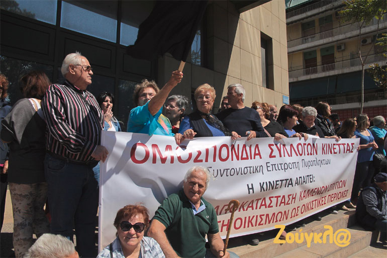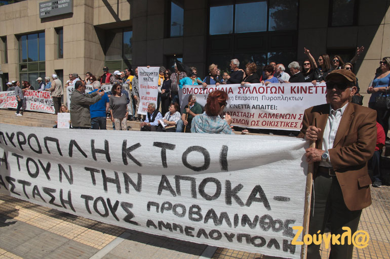 Συγκέντρωση διαμαρτυρίας πραγματοποίησαν σήμερα έξω από το Υπουργείο Περιβάλλοντος επιτροπές πυρόπληκτων από το Μάτι, τον Νέο Βουτζά, την Κινέτα και άλλες περιοχές που επλήγησαν πέρυσι τον Ιούλιο από τις πολύνεκρες πυρκαγιές.