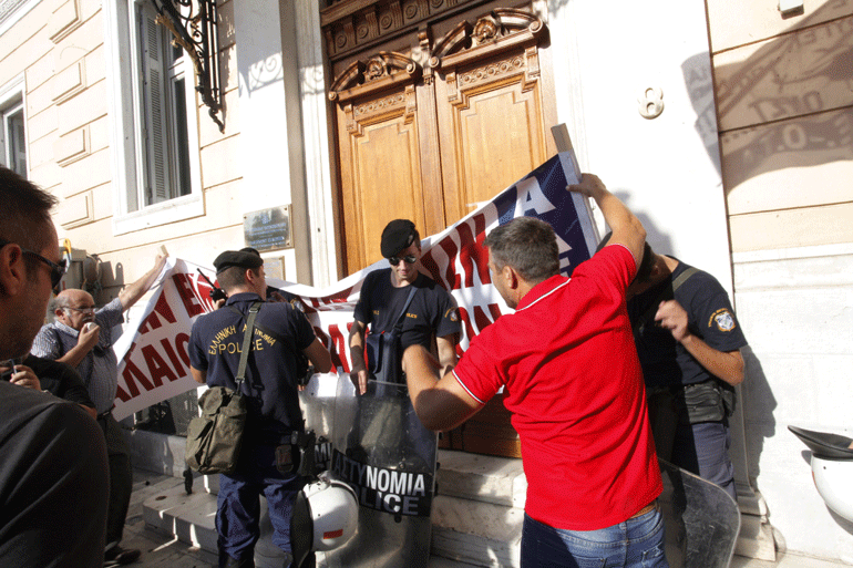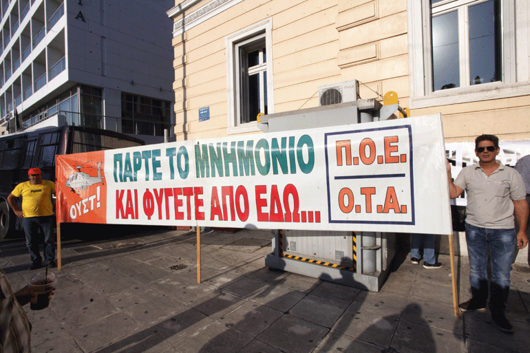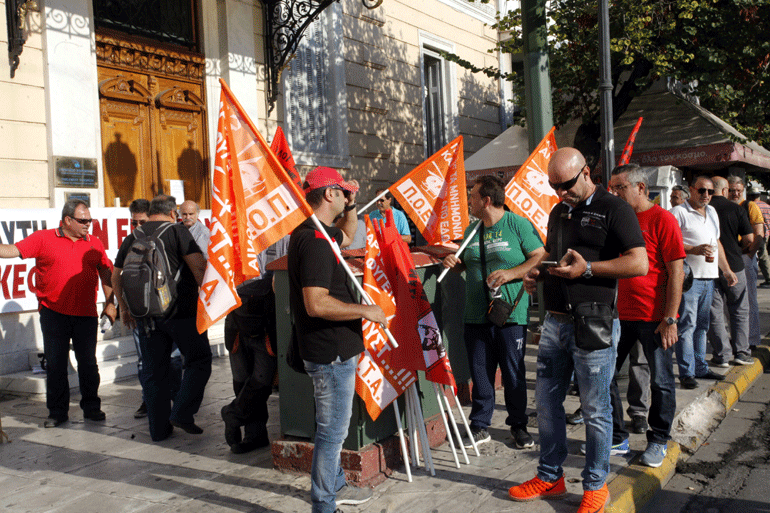 Συγκέντρωση διαμαρτυρίας πραγματοποιούν η ΠΟΕ-ΟΤΑ και η ΑΔΕΔΥ έξω από τα γραφεία του Ευρωπαϊκού Κοινοβουλίου στην Αθήνα, όπου βρίσκεται σε εξέλιξη συζήτηση για θέματα κοινωνικής πολιτικής μεταξύ της πολιτικής ηγεσίας του Υπουργείου Εργασίας και φορέων της Ευρωπαϊκής Ένωσης.