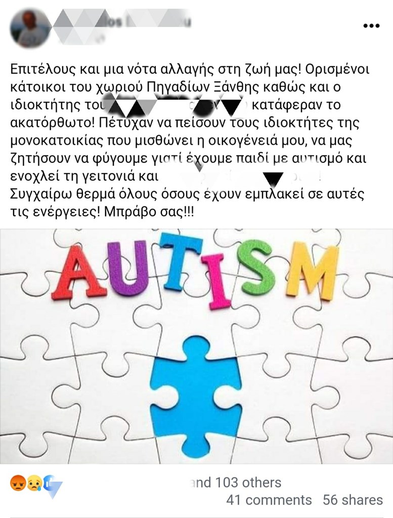 Ο πατέρας καταγγέλλει ότι οι ιδιοκτήτες της μονοκατοικίας που μισθώνει του ζήτησαν να φύγει από το σπίτι «επειδή το παιδί του ενοχλεί την γειτονιά», όπως αναφέρει σε σχετική ανάρτησή του στα social media.