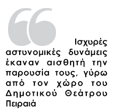 Ισχυρές αστυνομικές δυνάμεις έκαναν αισθητή την παρουσία τους, γύρω από τον χώρο του ανακαινισμένου Δημοτικού Θεάτρου της πόλης, υπό τον φόβο επεισοδίων μεταξύ αντιφασιστικών οργανώσεων και μελών της Χρυσής Αυγής. Τελικά, επικράτησε μικρή ένταση με υβριστικά συνθήματα μεταξύ μελών της Χρυσής Αυγής, που παρέμειναν στην ταράτσα του κτηρίου του κόμματος, και ομάδας της ΚΕΕΡΦΑ.