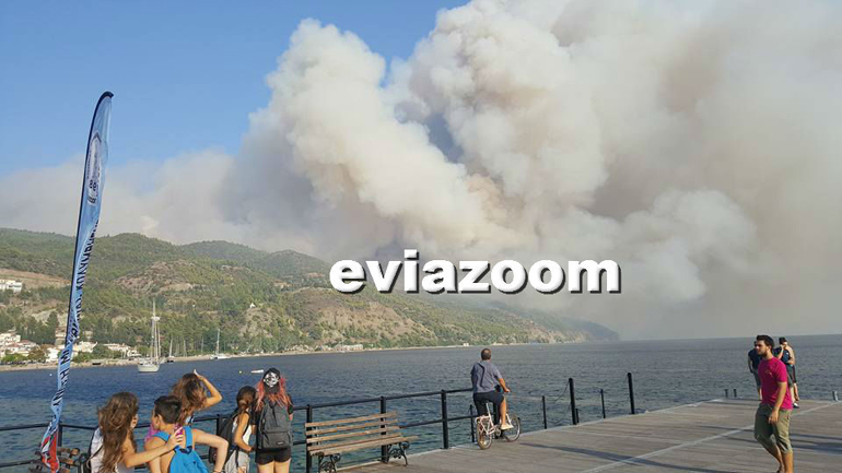 Η φωτιά ξεκίνησε από την περιοχή Φαράκλα στις 12.00 το μεσημέρι του Σαββάτου και έφτασε σε λίγες ώρες πάνω από την παραθαλάσσια περιοχή Κατούνια της Λίμνης. Τη νύχτα, οι διαστάσεις της πυρκαγιάς γιγαντώθηκαν και ο δήμαρχος κάνει λόγο για “βιβλική καταστροφή”.